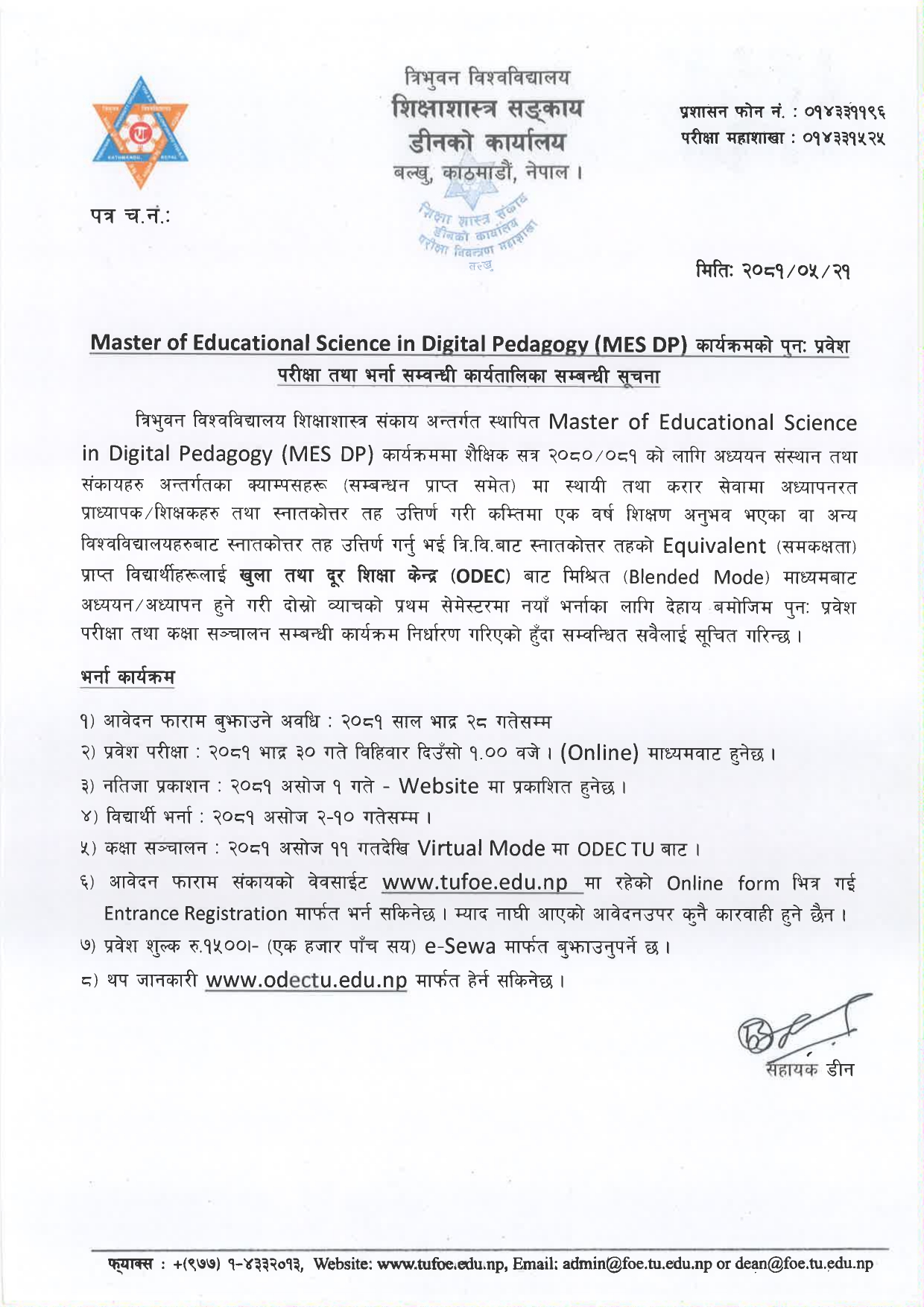 Masters of Educational Science in Digital Pedagogy(MESDP) कार्यक्रमको पुनःप्रवेश परीक्षा तथा भर्ना सम्बन्धी कार्यतालिकाको सूचना