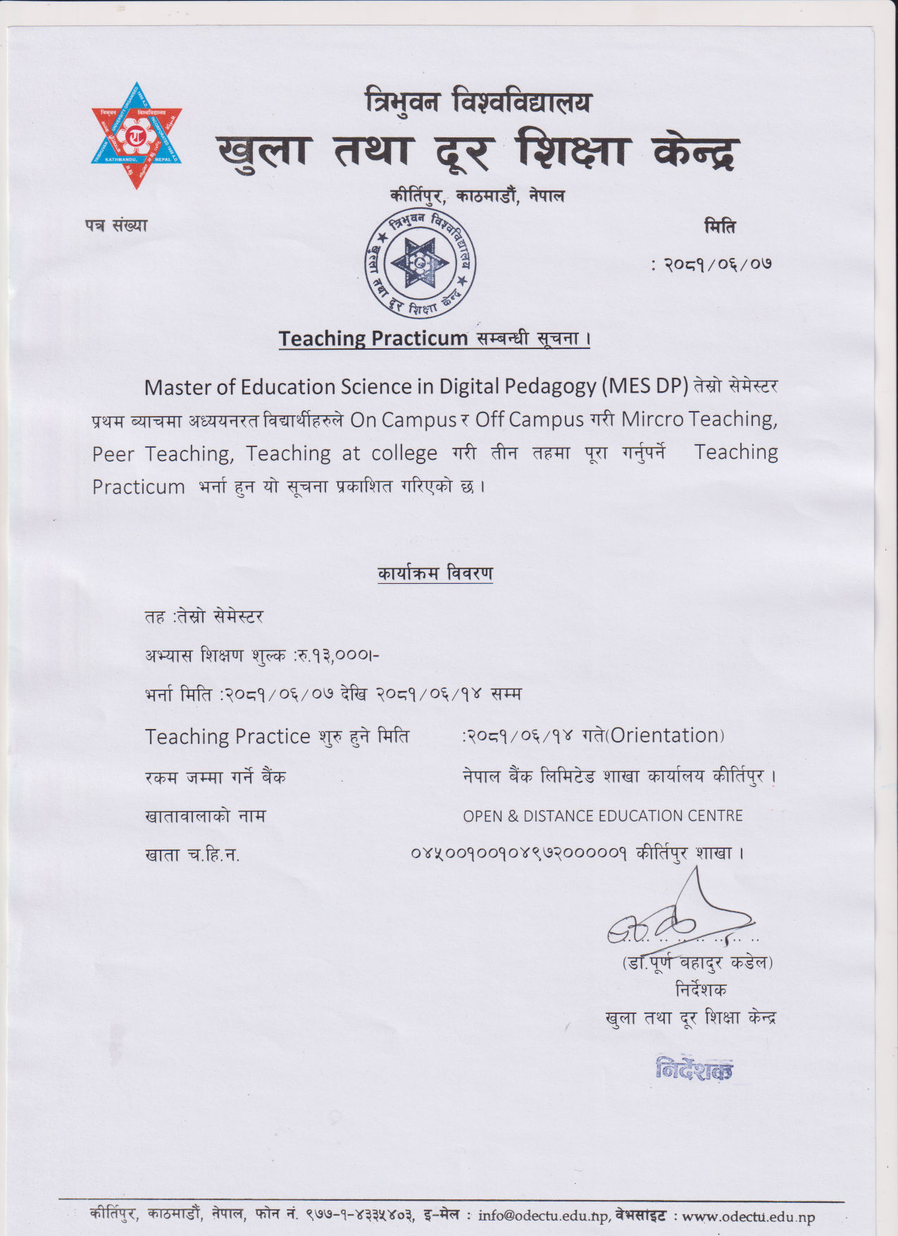 MESDP तेस्रो सेमेस्टर प्रथम ब्याचको Teaching Practicum सम्बन्धी सूचना